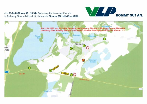 125 21.04.2026 – 21.04.2026 Am 21.04.2026 ist die Kreuzung Pinnow in Richtung Pinnow Mitteldrift von 08:00 bis 15:00 Uhr gesperrt. Die Haltestelle Pinnow Mitteldrift entfällt in diesem Zeitraum. Eine Umleitung ist eingerichtet (siehe Grafik). Betroffen sind die Linie 125 sowie der Rufbus 841. Vielen Dank für Ihr Verständnis. Ihre VLP
